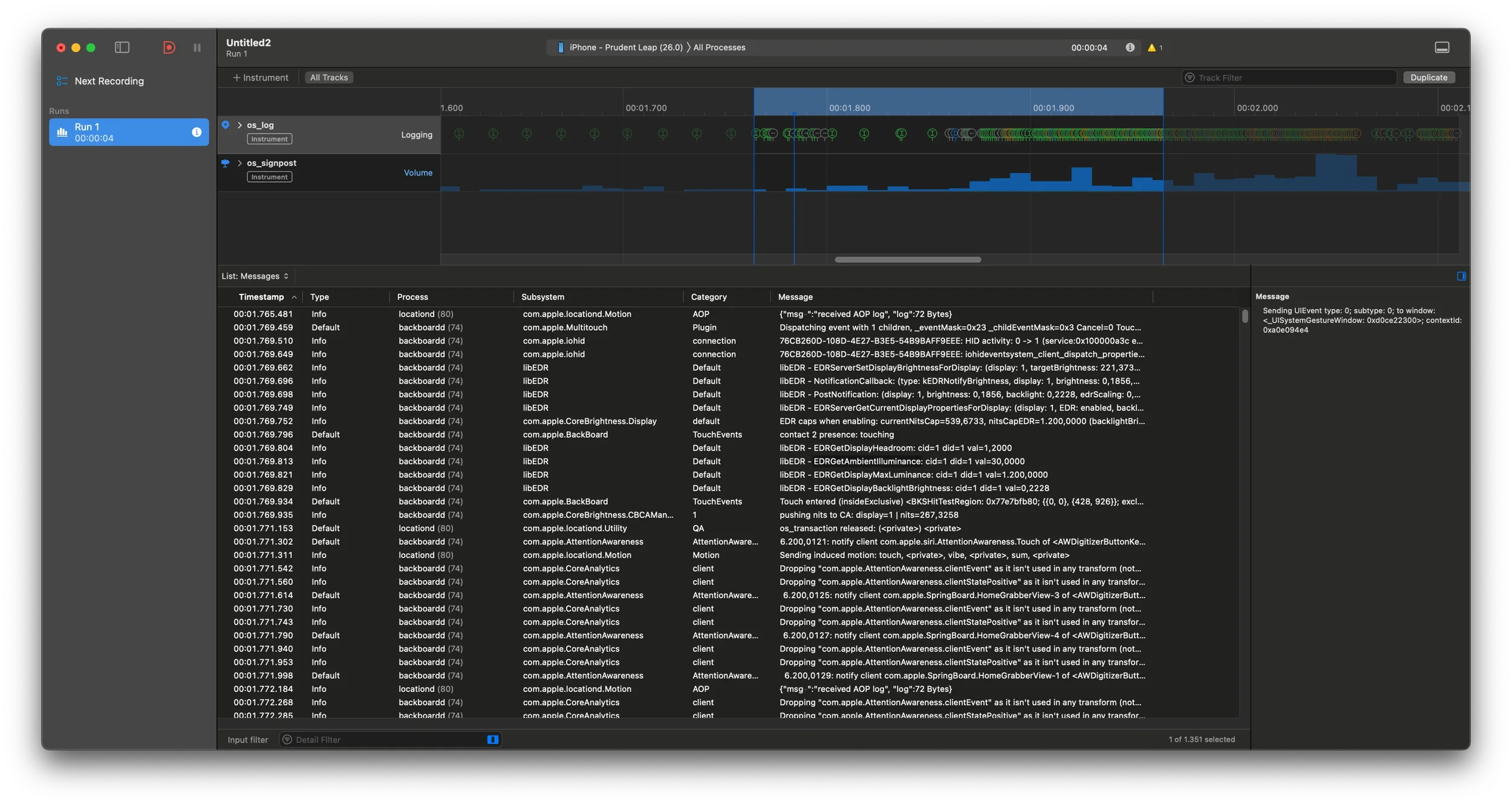 To make it easier to follow, switch the device to Airplane mode. Since Airplane Mode turns off all wireless services, make sure the device is paired with your Mac via a cable. Also, make sure the device is unlocked and that TrueTone is off ( also to minimize the amount of events the logger would capture). Finally, make sure you switch the Recording Mode to Deferred, to make sure the logger doesn’t drop events.