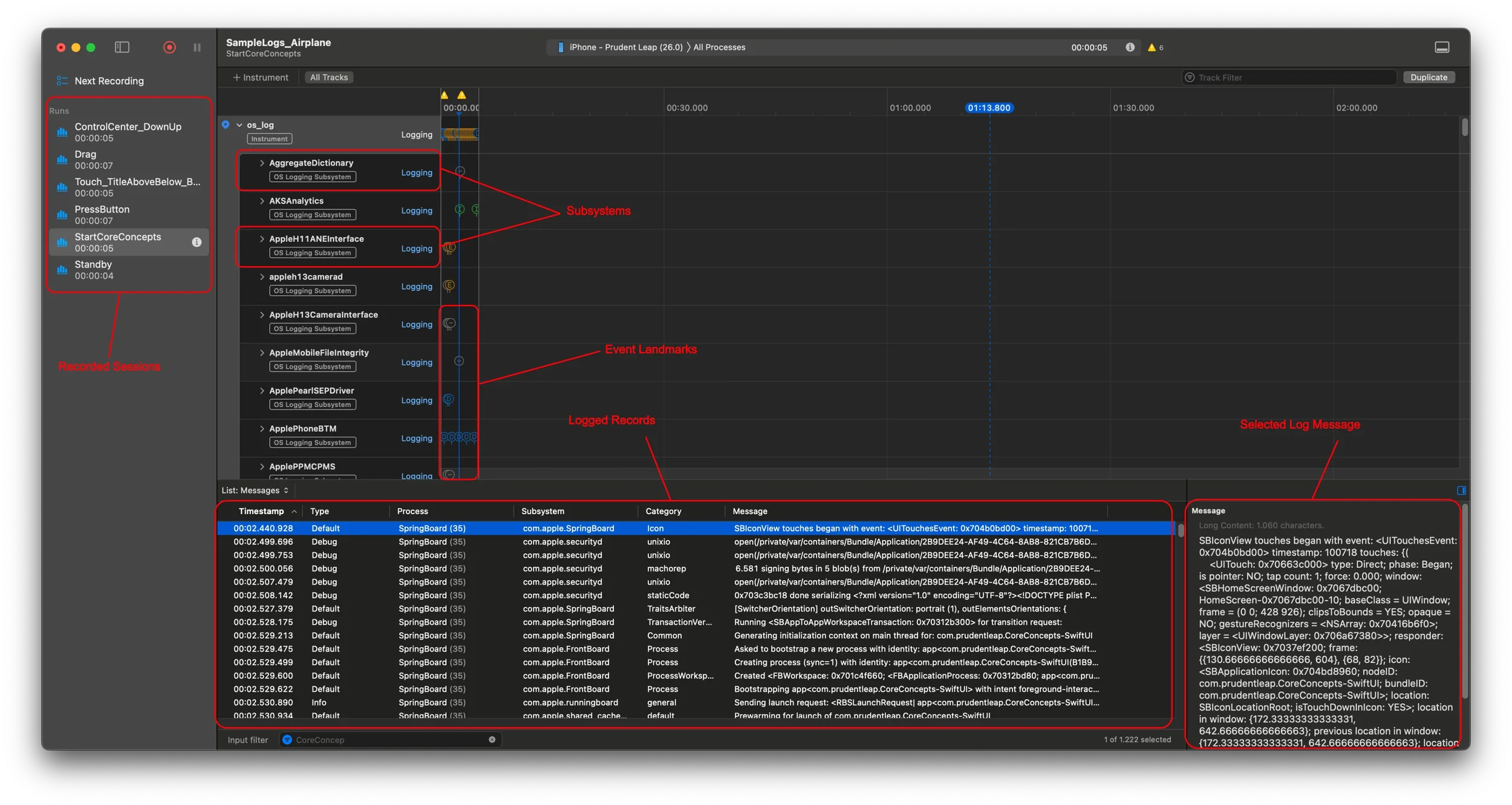 The Instruments application's User Interface is designed to streamline the viewing, organizing, and filtering of captured events while serving as a centralized repository for recording sessions across multiple test cases. The screenshot below demonstrates a scenario where logs were captured across various test cases, which are displayed in the Recorded Sessions section.