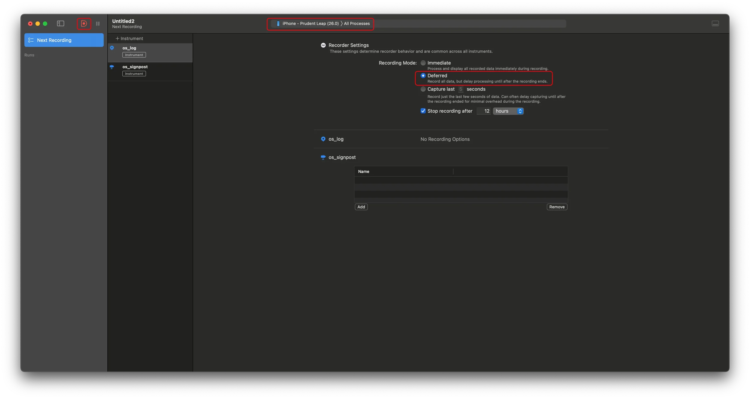 The Instruments UI also features a central Toolbar, similar to Xcode, allowing you to select your target device and specify which process to monitor during recording sessions. You can configure the recorder to capture all processes system-wide or focus on a specific application, system process, or app extension. The toolbar also displays currently running applications on the connected device, functioning similarly to the ps -eaf command in the macOS Terminal.