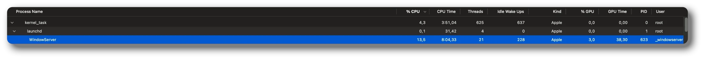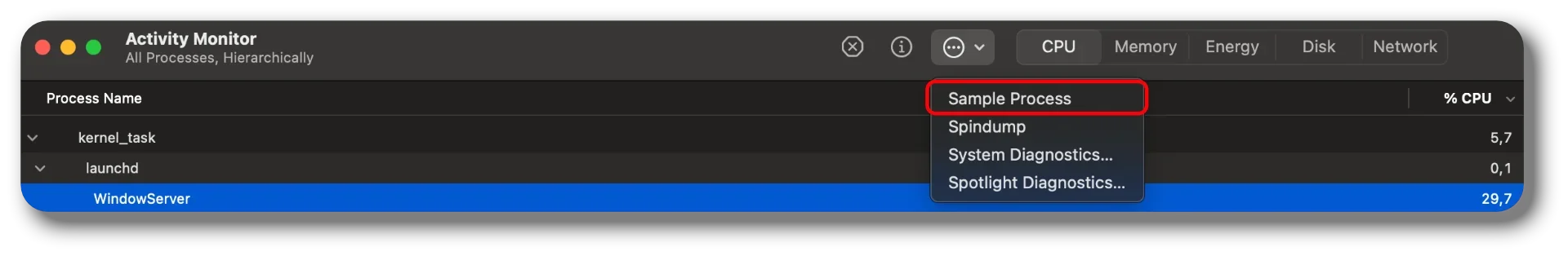 If you run the Activity Monitor as a Task Manager, you can also sample any running process. As shown in the screenshot below, you would select the process you’re interested in (WindowServer in this case).