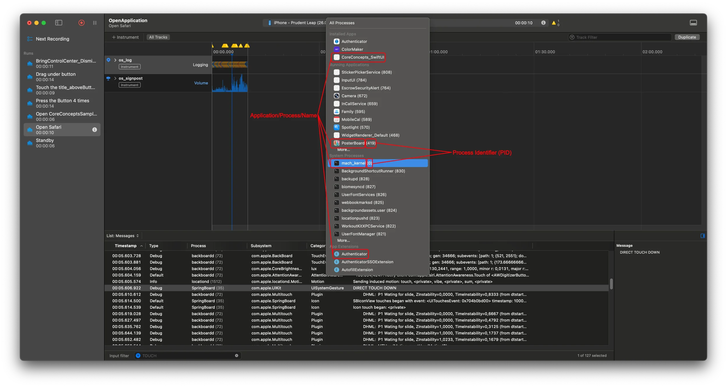 As shown in the screenshot below, you have several monitoring options to choose from. Like macOS, iOS assigns process IDs (PIDs) sequentially. In other words, lower PIDs indicate processes that started closer to system boot time. Note that certain processes cannot be monitored through Instruments due to security restrictions.