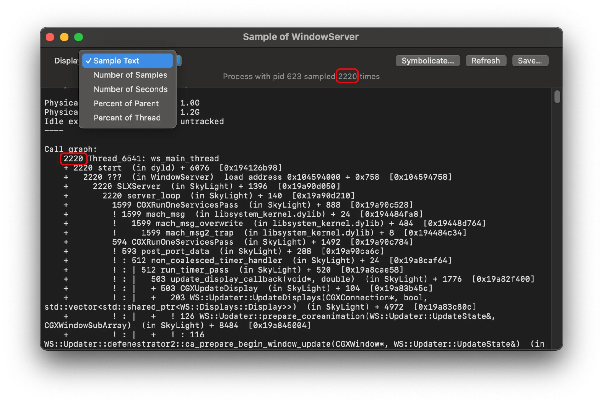 Once the sampling process is complete, Activity Monitor opens up a dedicated Sample Window. You can then choose from multiple Display Options and analyze the process call graph. You can then cross-reference the calls with Apple’s documentation, to determine what each call does. Notice how, for example, 2220 represents the amount of times the thread/call was found during the sample period - and it does not represent a Process ID.
