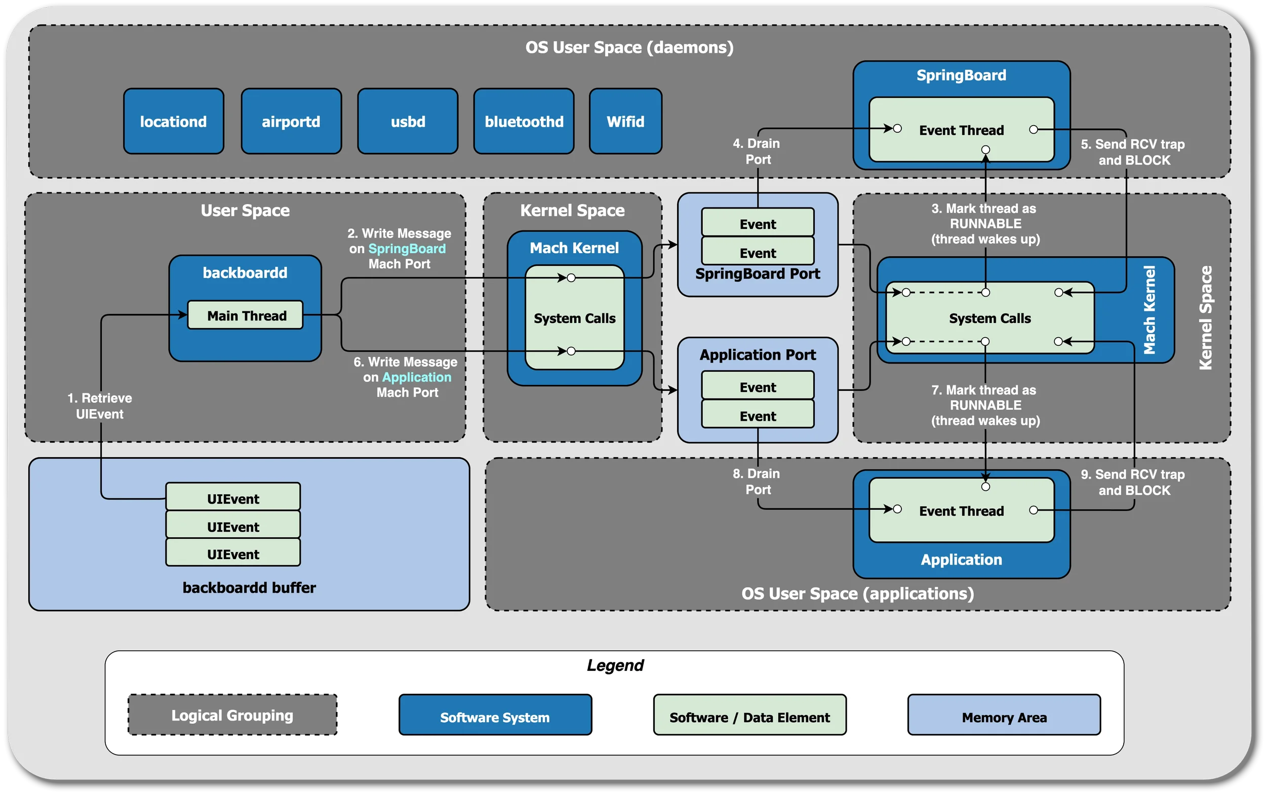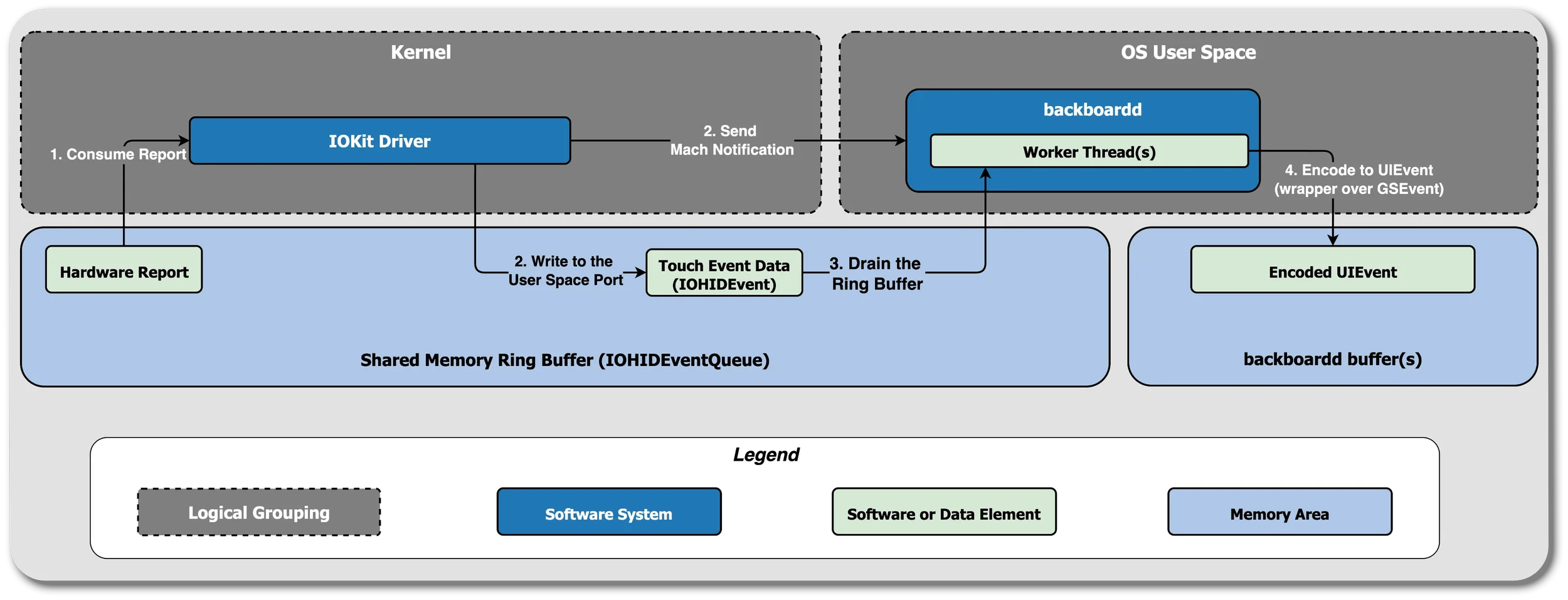 After the IOKit driver consumes the processed touch information from the Ping-Pong buffers, using the structures described in the post Exploring Apple’s drivers ecosystem, it persists the message in a dedicated shared memory ring buffer, implemented as an IOSharedDataQueue. When data is added to this buffer, registered clients (particularly the backboardddaemon) receive a Mach notification, which in turn wakes the daemon’s event dispatcher thread. Backboardd then dequeuesevents from the shared memory buffer and further processes them.