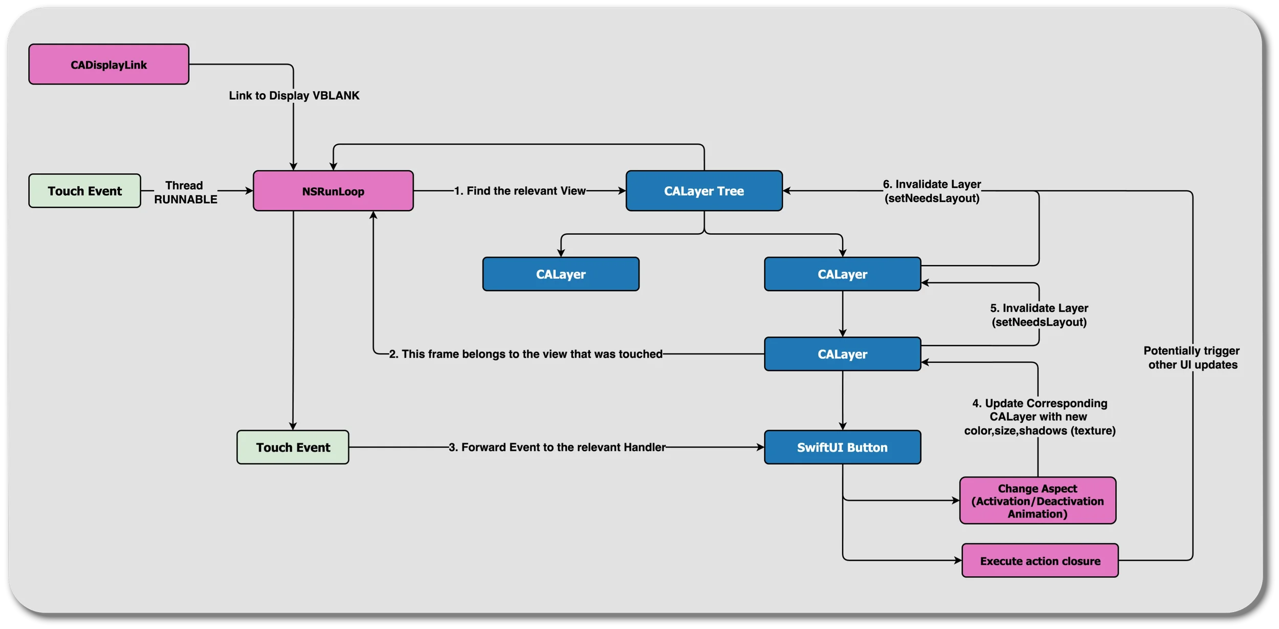 In our example, since the end-user just touched then released the button, the first event sent by backboardd is translated to a touchDown event. Since the touch occurred within the frame of a button, the UI framework runs the code associated with the control’s activation animation. Typically, this animation extends over several frames, depending on the way the animation is configured. To prepare the first frame in the animation, the Application (more specifically the code that handles the UI, such as SwiftUI or UIKit) updates the characteristics of the Button control. For example, it changes a the color to a different, lighter shade, to act as a highlight, while also scaling the shape down and perhaps adding some changes to the button’s shadows and outlines. After all changes required for the first frame of the animation are processed, they result in an update to the underlying CALayer construct (within the CoreAnimation framework). Whenever a view needs to change its aspect, the underlying CoreAnimation CALayer structure triggers a setNeedsLayout layout call. The function invalidates the view (more on this in the SwiftUI sections), which results in an update in the Application’s CALayer Tree. The diagram below outlines this process.