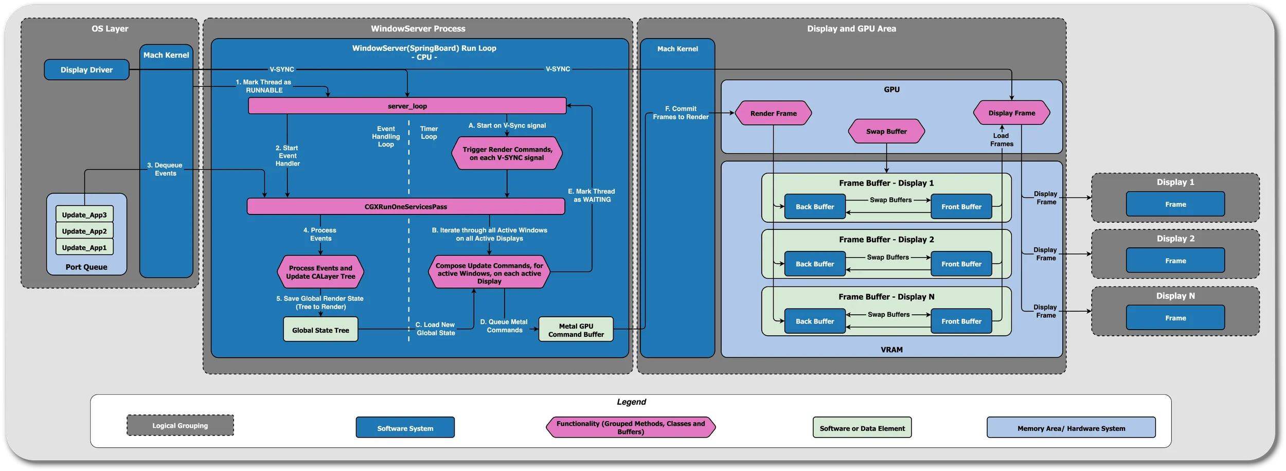 (Apple calls this the event phase), all within a V-Sync Interval. Once this synchronous, blocking process is complete, the application moves to the commit phase, where it sends the new CALayer Tree information to another process, known as the Render Server. Since it’s an inter-process communication flow, it’s also implemented through Mach Ports.