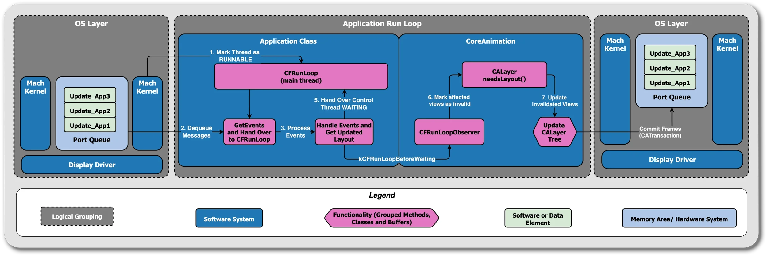 When the visual content of an application needs to be updated, the UI framework schedules rendering updates as part of a mechanism commonly referred to as the Render Loop. This process is typically synchronized with the device’s display (or, if more than one display is connected, the fastest display) using a CADisplayLink object.
